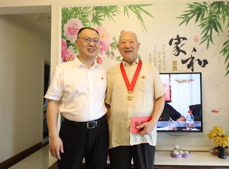 在老党员刘大荣家里,李旭东关切地询问了刘老和老伴的身体状况及生活现状,亲手为刘大荣同志佩戴上由中共中央颁发的“光荣在党50年”纪念章并送上慰问金,祝福老人家身体安康、健康长寿。80多岁高龄的老党员刘大荣精神抖擞,他用朴素的话语表达了自己的感激之情:“感谢党的恩情,感谢集团对我们的关怀!”