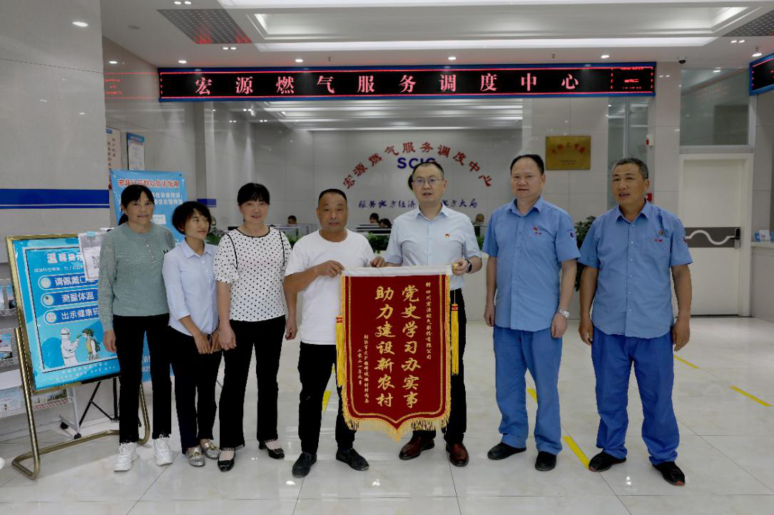 2021年9月15日15:00,文升镇邓诚垭村党支部书记、主任覃春带领村干部代表、用户代表将“党史学习办实事,助力建设新农村”的锦旗送到川投水务集团党委委员、副总经理、宏源公司党委书记、董事长、总经理李旭东的手中,代表全村用户感谢宏源公司为邓诚垭村天然气安装的优质服务和为发展新农村以及乡村振兴建设作出的积极努力与贡献。