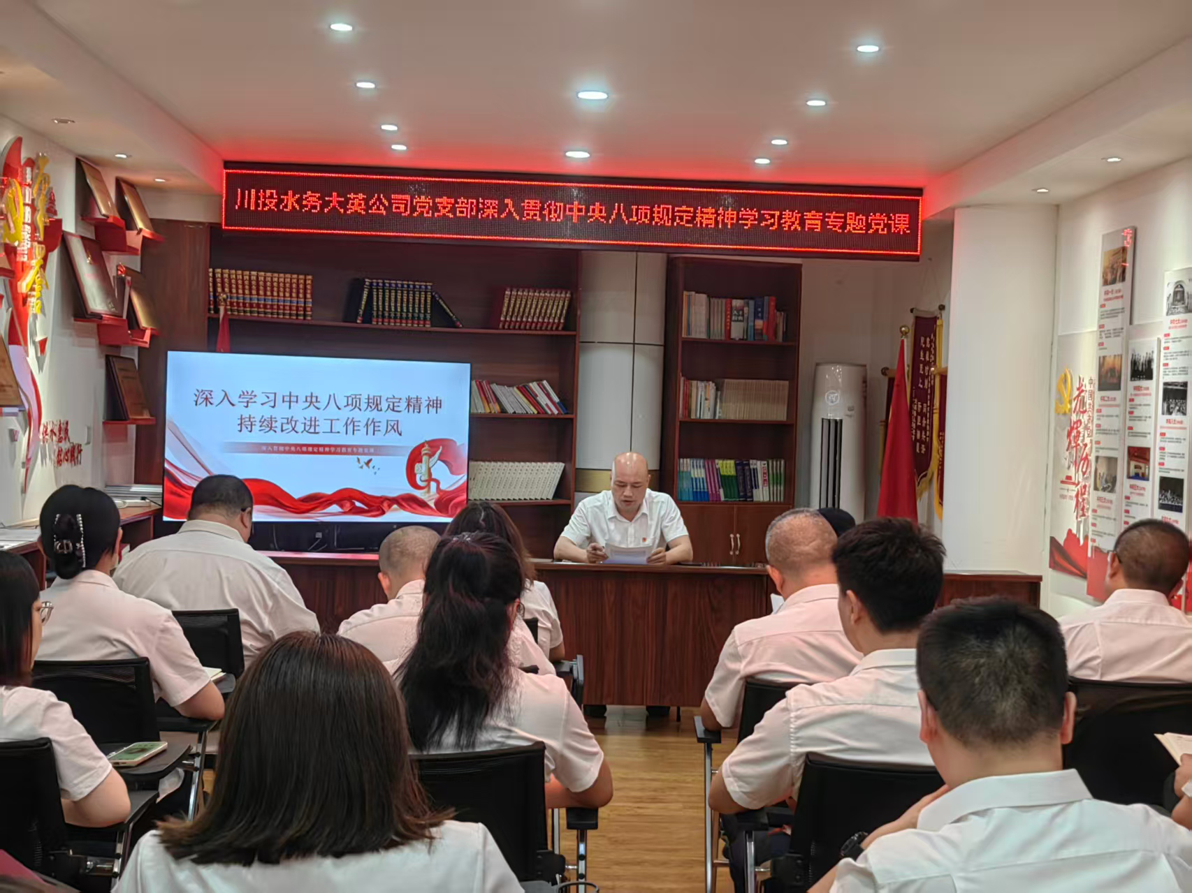 为深入贯彻落实中央八项规定精神,持续改进工作作风建设,川投水务大英公司党支部于6月19日在公司党员活动室开展了“深入贯彻中央八项规定精神学习教育”专题党课,全体党员参加了此次学习。
