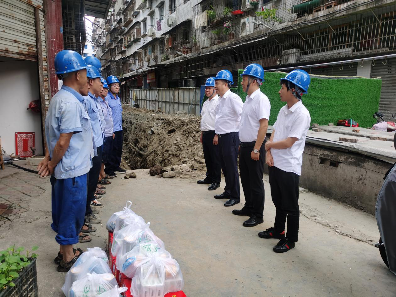今年入夏以来,射洪市气温居高不下,一线工作者备受“烤”验。为了保障员工身体健康,确保安全生产,8月14日下午,川投水务集团公司党委委员、副总经理刘松果率队前往射洪水司红星路管网改造施工现场对作业员工进行夏日防暑降温送清凉慰问。