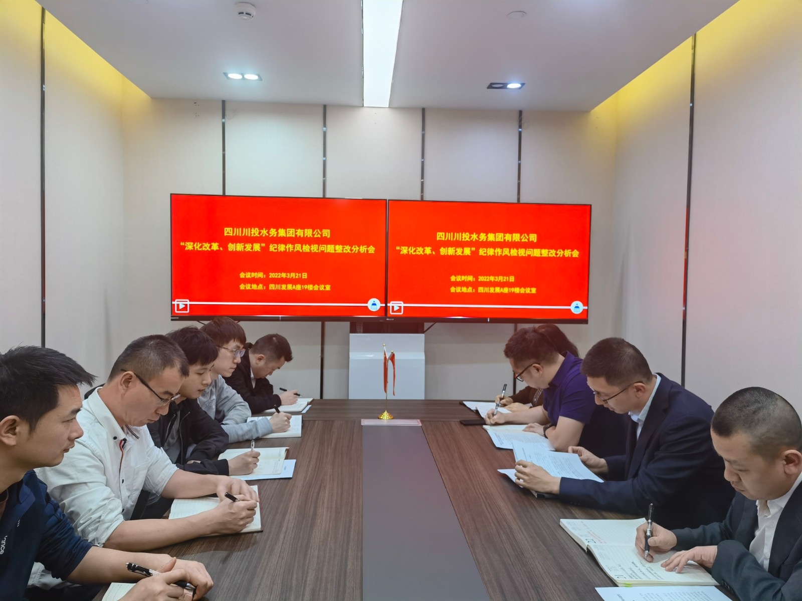 2022年3月21日,为贯彻落实四川发展党委“深化改革、创新发展”纪律作风整顿相关工作要求,开展好第二阶段“紧盯突出问题,全面集中整改”工作任务,进一步加强督促与指导工作同频共振,切实将整改措施落到实处。川投水务集团本部认真组织召开了“深化改革、创新发展”纪律作风问题整改情况分析会,会议由川投水务集团党委委员、副总经理严斯亮主持。