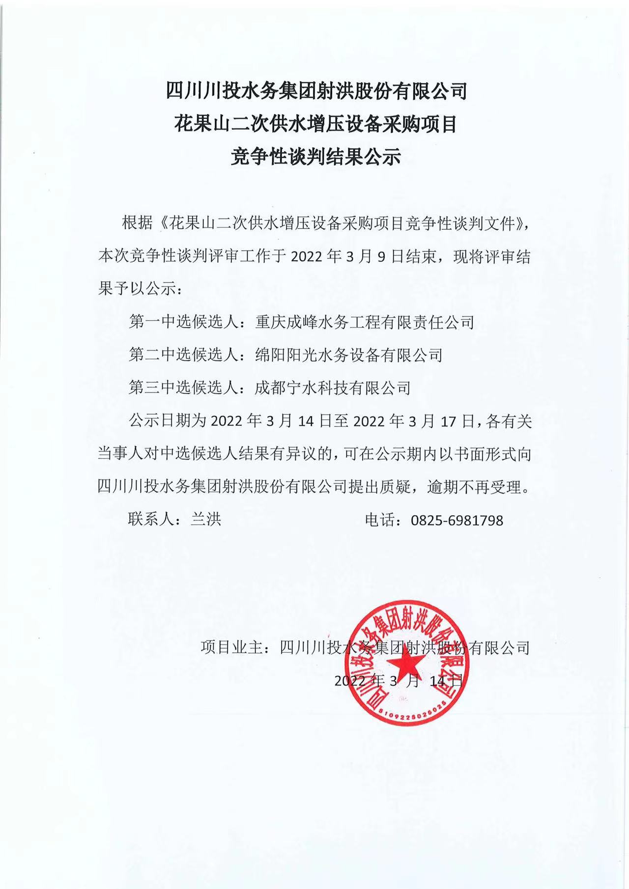 上一条:四川川投水务集团股份有限公司射洪市新建自来水厂可行性研究报告编制项目比选公告(第二次)